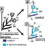 しかし、生殖器官形態が大きく異なる現生裸子植物がどうして単系統になるのか納得できませんでした。そこで、MADS-box遺伝子やLEAFY遺伝子の発現様式を調べたところ、従来考えられてこなかったような相同性がうかび上がり、化石記録も考慮すると自分なりに納得できる解釈ができました(Shindo et al. 2001)。