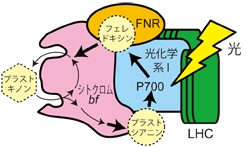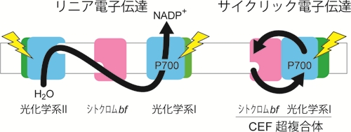 CEF超複合体と名付けられたこの超複合体に光を照射すると,電子は光化学系Iから隣に結合したシトクロムbf複合体へと移動し,また光化学系I内に残された正電荷はシトクロムbf複合体からの電子によって消滅します.