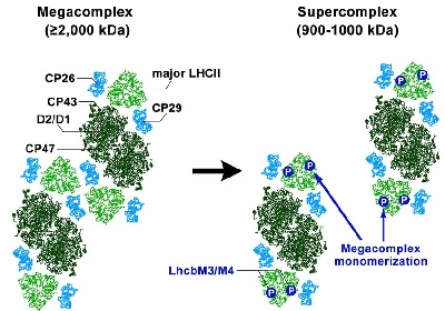ステート遷移が起こると,まず,三量体 LHCIIの一部がリン酸化され,PSIIメガ複合体は1つ1つのPSII超複合体に分離します.