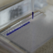 遺伝子改変マウスを用いて、分子生物学をはじめとする種々の手法により、生殖幹細胞研究の支援を行っています。写真はアガロース電気泳動により遺伝子型判定を行う様子です。(水口)