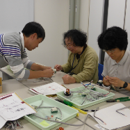 ほとんどの実験装置は電気を動力しており、コンセントにプラグを差し込むだけで機器は動きます。ただし、電気器具は取り扱いを間違えると事故につながります。本研修では電気の基礎知識から簡単な電気工作まで幅広い内容を取り扱いました。講師は技術職員で第2種電気工事士の資格保持者が務めました。(講師:諸岡)