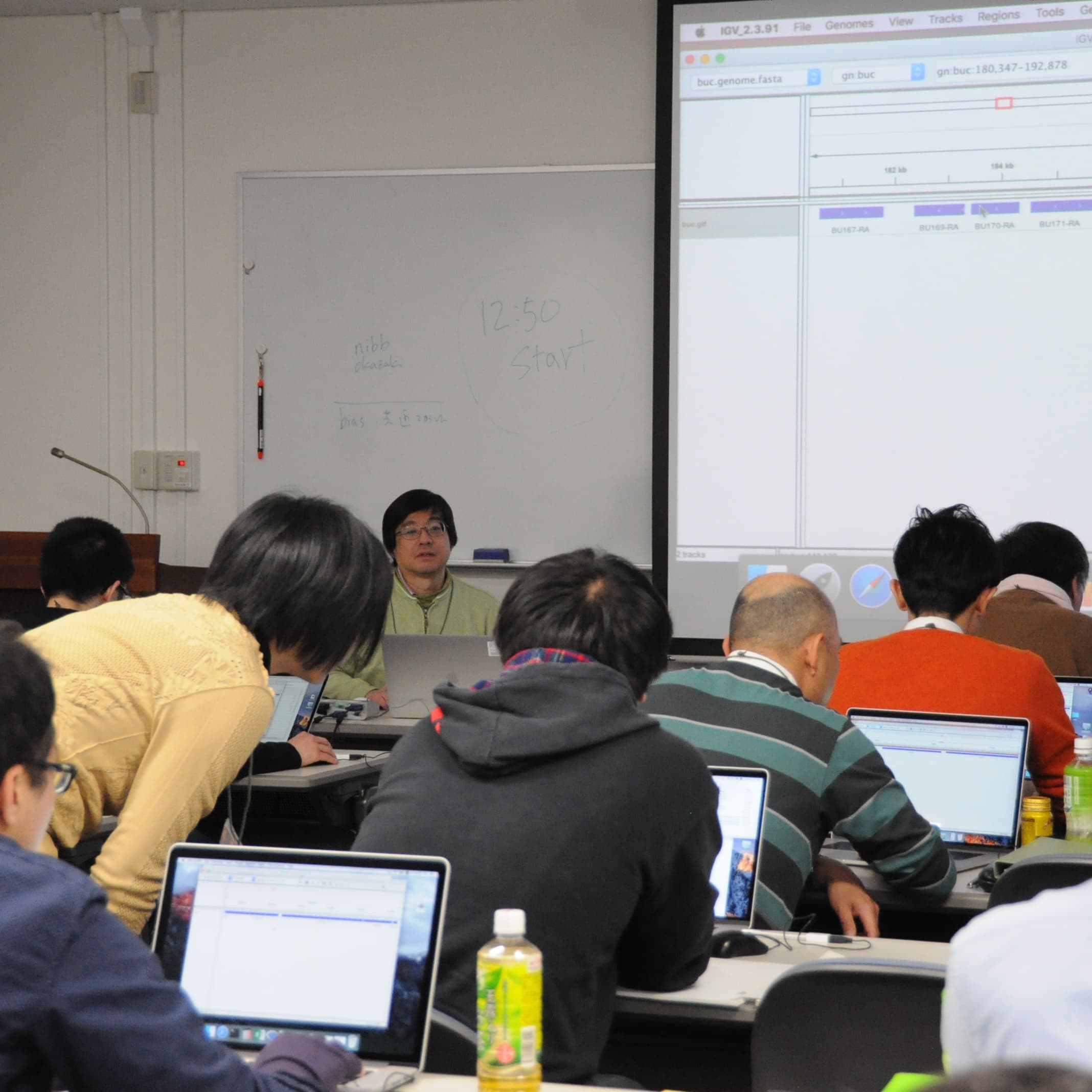 実験生物学者向けのバイオインフォマティクスの講座として、ゲノムインフォマティクストレーニングコース(GITC)を年に 4 回ほど開催しています。技術職員・支援員は講師や事務局を務め、コースの運営に関わっています。