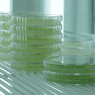ヒメツリガネゴケは形質転換も容易で、生物の進化を研究するためのモデル植物として利用されています。写真はプレートで培養中のヒメツリガネゴケ。(大井)