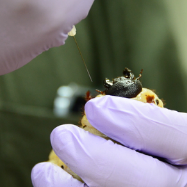 遺伝子の機能を調べるためには、目的の遺伝子の機能を低下、破壊したり、増幅させて、生き物に現れる変化を観察します。RNAi は、面倒な遺伝子組換えを行わず、標的の遺伝子の機能を低下させる(ノックダウン)手法の一つです。写真は、ヘラクレスオオカブトの幼虫に二本鎖RNAを投与し、蛹や成虫に変化が起こるか実験をしています。(水谷)