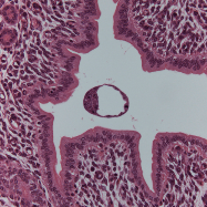 組織学的手法を用いてマウス初期胚の観察を行っています。写真はHE染色した子宮内の受精後3日目のマウス胚です。(岡)