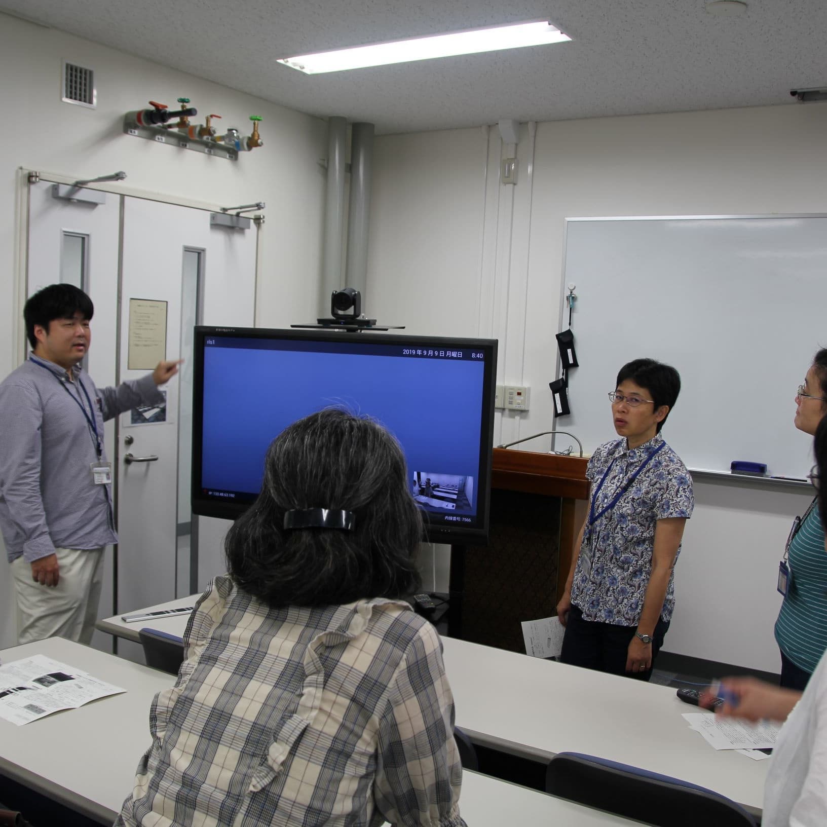 所内に設置されているテレビ会議システムの活用を目指して、実際の使用方法を体験しました。(講師:中村)